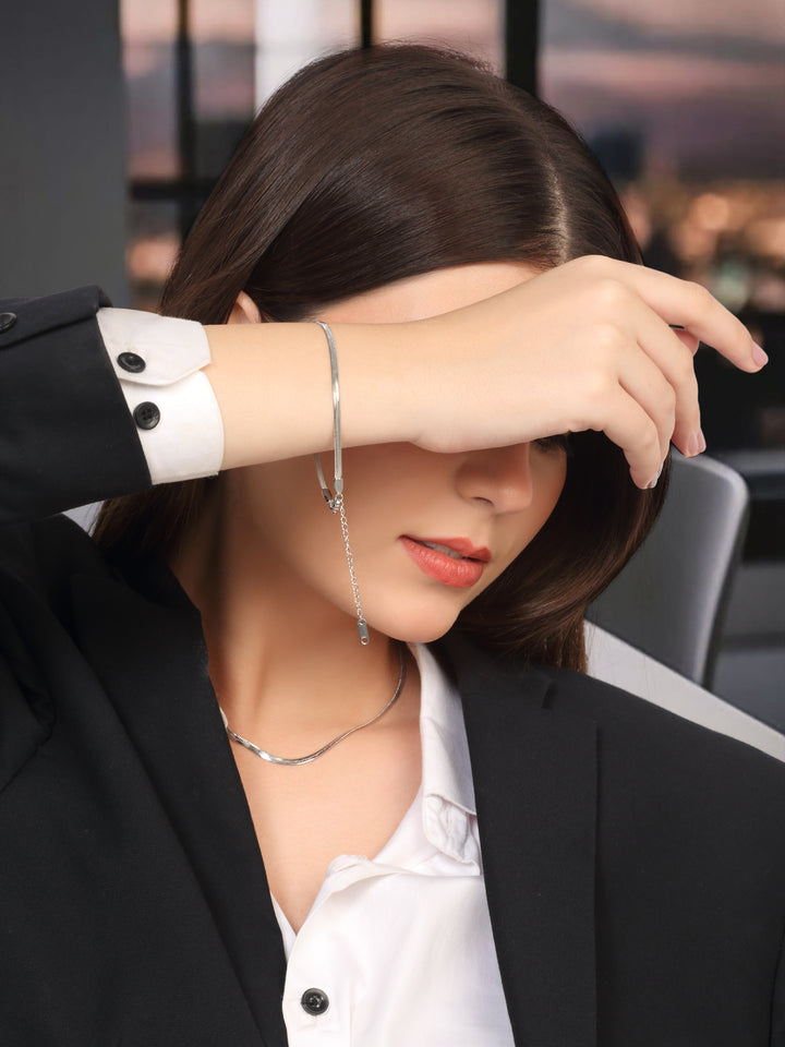 Classic, chic, and versatile - this 2-piece set includes a flat silver snake chain necklace and a matching bracelet. Designed for effortless styling, it’s the perfect accessory to elevate your everyday looks or polish up your evening wear.