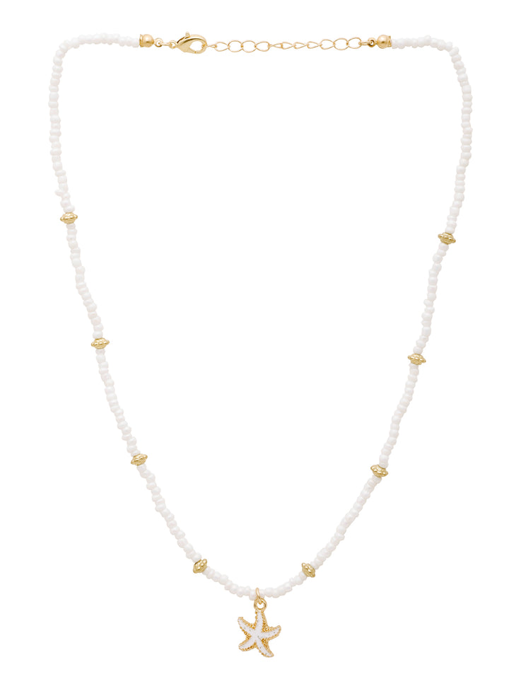 Bring the ocean vibes to your style with this 3-piece layered necklace set featuring rice beads, gold-toned starfish, and shell charms. Designed with a mix of white and gold beads, this necklace set offers a playful and trendy look that’s perfect for vacations, campus cool outfits, or music festivals. Lightweight and chic, it also makes a thoughtful gift for women who love beach-inspired jewellery.