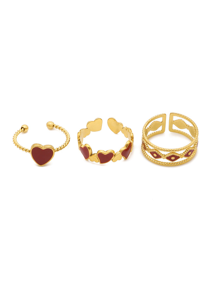 3 Pcs Adjustable Red Enamel Heart Ring Set