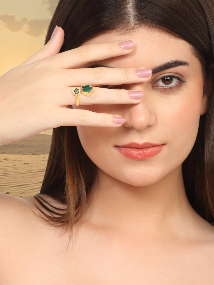 A statement piece that speaks for itself. This 18k gold-plated adjustable ring is designed with a stunning coloured stone set in a golden open band. With its striking mix of gold and vibrant hues, it’s the kind of ring that turns every look into something unforgettable.