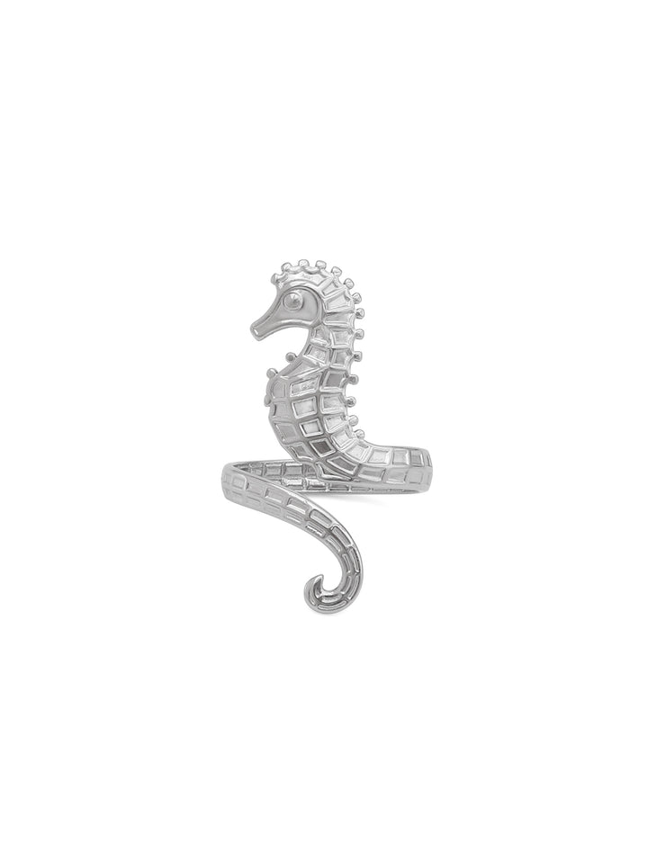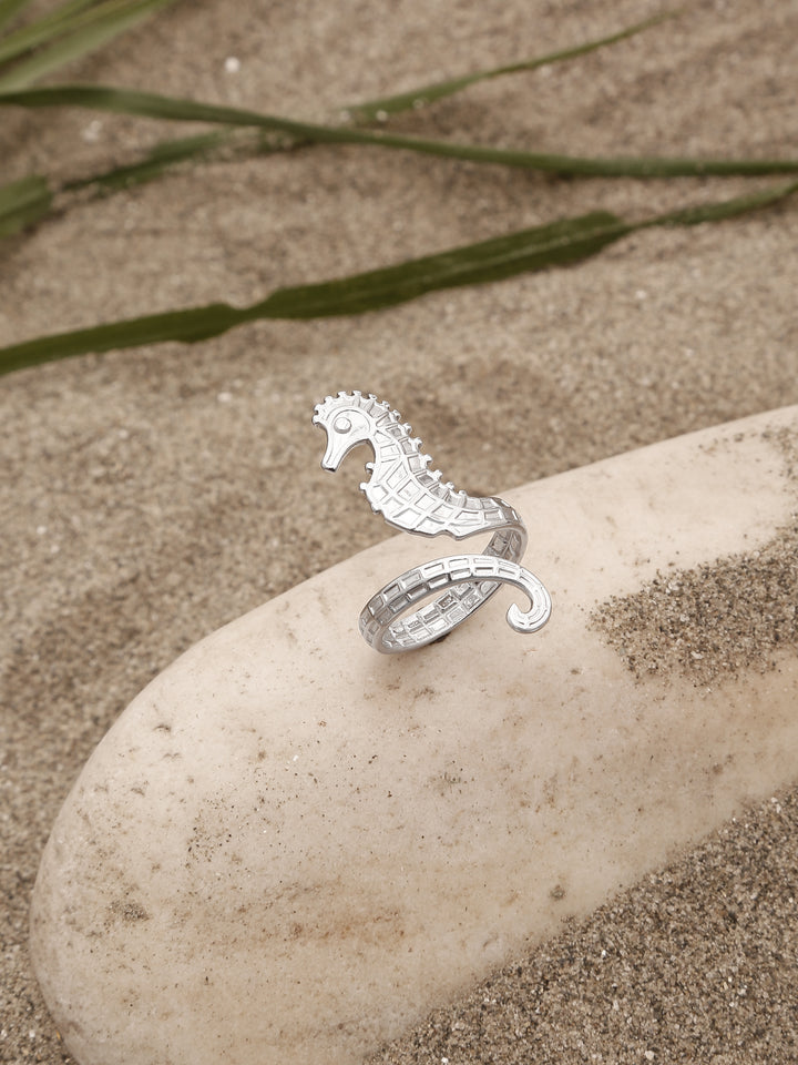Bring a splash of ocean charm to your jewellery box with this silver seahorse open ring. Designed in a sleek adjustable fit, it makes the perfect statement piece for parties, vacations, or music festivals. Whether you style it solo or layer it with other rings, this piece always stands out.